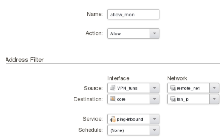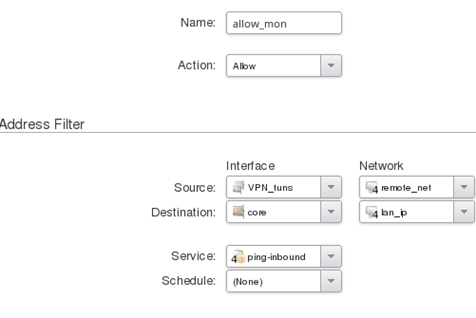 add IPRule Action=Allow SourceInterface=VPN_tuns SourceNetwork=remote_net DestinationInterface=core DestinationNetwork=InterfaceAddresses/lan_ip Service=ping-inbound Name=allow_mon