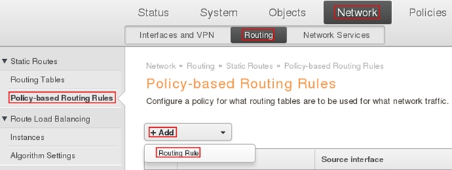 Пройдите Network → Routing → Policy-based Routing Rules, нажмите кнопку Add из выпадающего меню выберите Routing Rule.