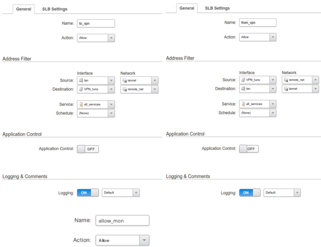 add IPRule Action=Allow SourceInterface=lan SourceNetwork=InterfaceAddresses/lannet DestinationInterface=VPN_tuns DestinationNetwork=remote_net Service=all_services Name=to_vpn