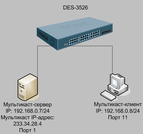 Задача: Запретить получение мультикаст-клиентом на порту 11 мультикаст-трафика от сервера на порту 1. Все порты коммутатора находятся в VLAN default.