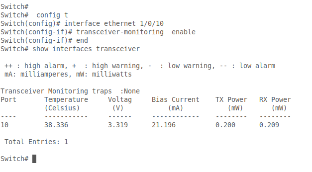 Это дает возможность администраторам сети проводить слежение в реальном времени и определять источник неисправности и прогнозировать отказ в работе трансивера. При этом сам трансивер также должен иметь поддержку DDM.