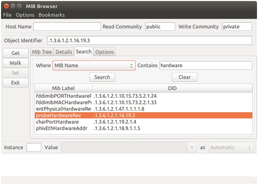 Поиск можно осуществлять по имени MIB или по описанию объекта. Рассмотрим поиск аппаратной версии по MIB имени на примере коммутатора DES-3200-28, для этого в разделе Search в поле Contains введём hardware и нажмём кнопку Search (рисунок 4).