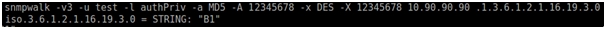 snmpwalk -v3 -u test -l authPriv -a MD5 -A 12345678 -x DES -X 12345678 10.90.90.90 1.3.6