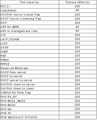 При включении Safeguard engine коммутатор начинает ограничивать полосу пропускания для пакетов, идущих на CPU. Пакеты, идущие на CPU и их ограничения приведены в таблице: