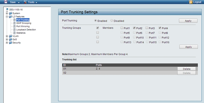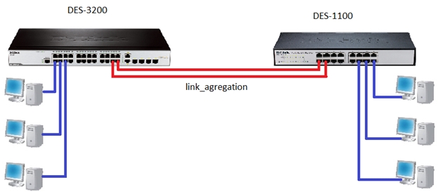 В примере используются порты 24,26 на DES-3200 и 2,4 на DES-1100.