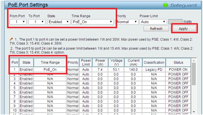 Обратите внимание, что настройка расписания задаёт начало и конец периода, в течении которого PoE будет подаваться на порт.