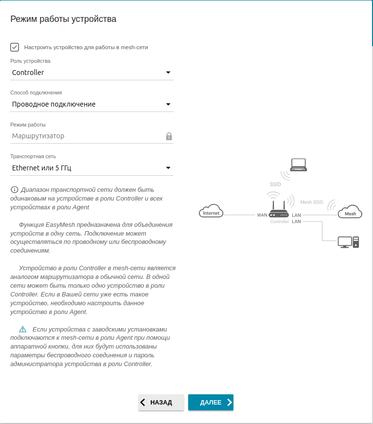 На странице Режим работы устройства установите флажок Настроить устройство для работы в mesh-сети.
