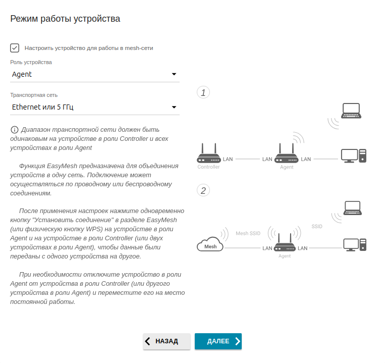 Откройте Web-интерфейс и запустите мастер настройки. На странице Режим работы устройства установите флажок Настроить устройство для работы в mesh-сети.