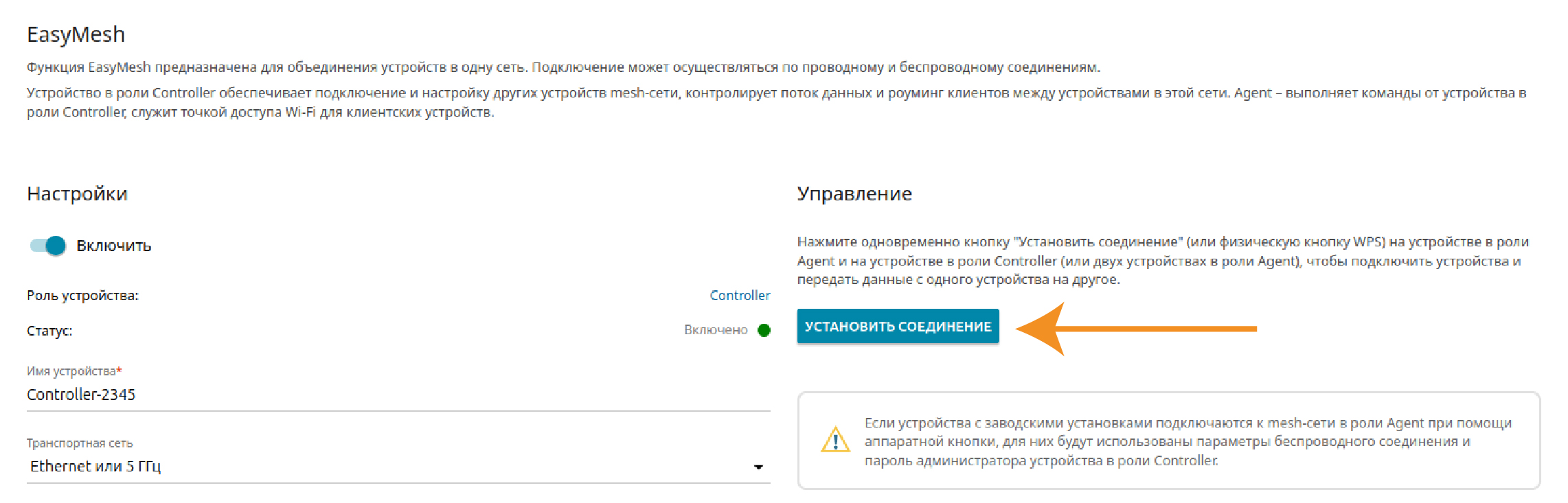 Перейдите на страницу EasyMesh агента и нажмите кнопку Установить соединение.
