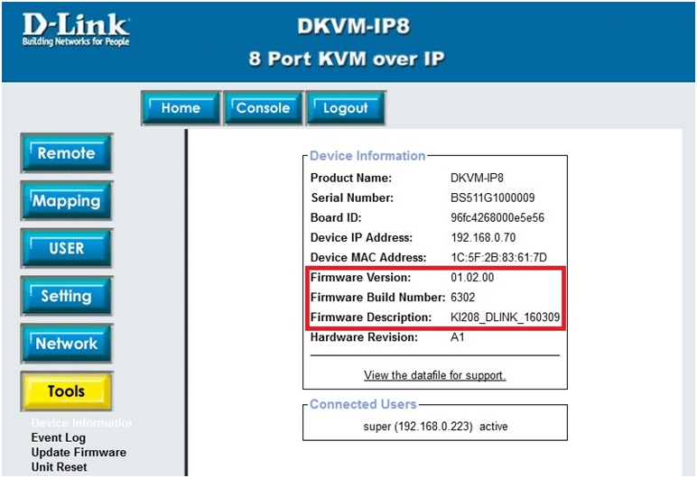Шаг 3. После завершения процесса обновления и перезапуска DKVM перейдите в раздел Tools и выберите пункт Device information. Убедитесь, что ПО обновлено корректно.