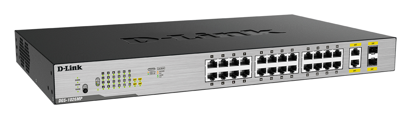 24 порта DGS-1026MP поддерживают стандарт IEEE 802.3at PoE. Каждый порт PoE подает питание мощностью до 30 Вт при общем бюджете коммутатора 370 Вт, что позволяет пользователям подключать к DGS-1026MP устройства, совместимые со стандартом 802.3at. Это позволяет размещать оборудование в труднодоступных местах вне зависимости от расположения электрических розеток и минимизировать прокладку кабеля. Соответствующие индикаторы, расположенные на передней панели коммутатора, позволяют пользователям контролировать используемый бюджет мощности PoE, что помогает им предотвратить проблемы, связанные с перегрузкой на PoE-портах.
