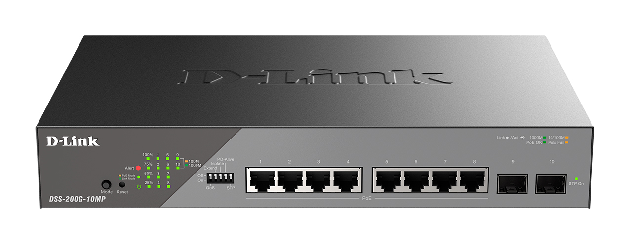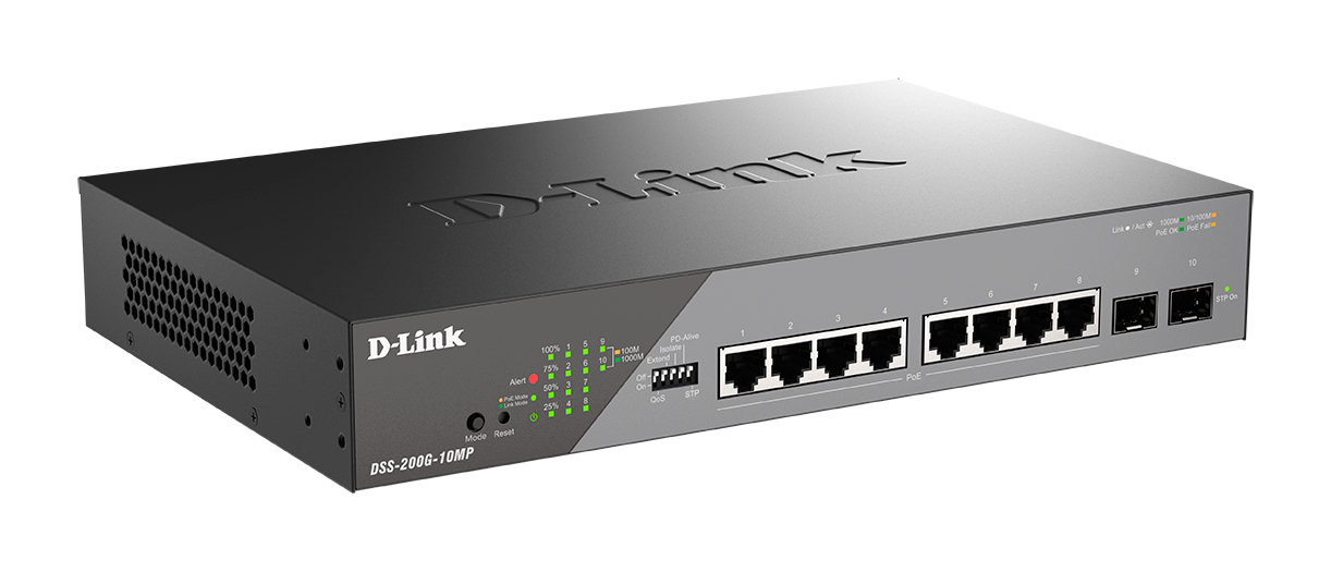 Управляемый L2-коммутатор DSS-200G-10MP, оснащенный 8 портами 10/100/1000Base-T с поддержкой PoE и 2 портами 1000Base-X SFP, предназначен для построения систем видеонаблюдения, IP-телефонии и корпоративных сетей Wi-Fi. По сравнению с серией DGS-1100V2, коммутаторы DSS-200G обладают рядом аппаратных и функциональных преимуществ, упрощающих развертывание и обслуживание современных систем видеонаблюдения и сетей с PoE. Устройства оснащены защитой от статического электричества до 6 кВ, сигнальным портом Alarm (RJ-45) и аппаратными DIP-переключателями для быстрой активации наиболее часто используемых функций без необходимости входа в Web-интерфейс. В дополнение к базовому функционалу реализована поддержка ERPS и расширенные функции управления и мониторинга PoE, включая Perpetual PoE, Fast PoE, PD Alive и подачу питания по расписанию. В Web-интерфейсе предусмотрен специальный режим для задач видеонаблюдения с возможностью мониторинга состояния портов, PoE-бюджета и автоматического обнаружения ONVIF-совместимого оборудования. Также поддерживается управление по SNMP.