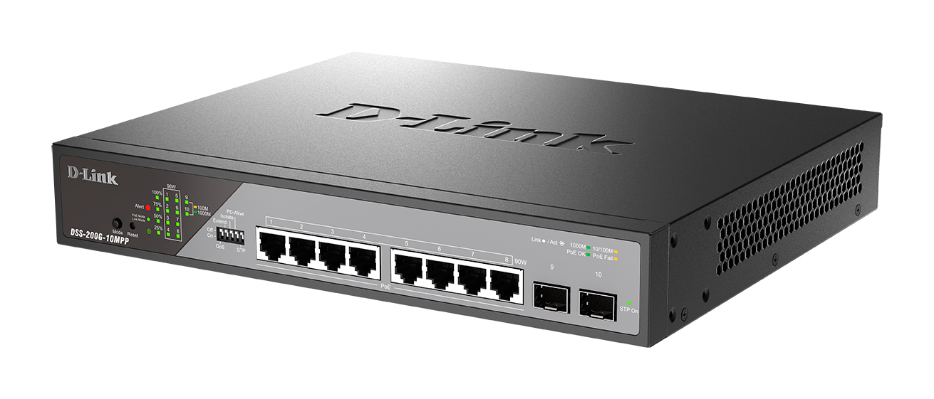 Управляемый L2 коммутатор DSS-200G-10MPP, оснащенный 8 портами 10/100/1000Base-T с поддержкой PoE и 2 портами 1000Base-X SFP, предназначен для построения систем видеонаблюдения, IP-телефонии и корпоративных сетей Wi-Fi, в том числе с использованием PoE-оборудования с потребляемой мощностью до 90 Вт. По сравнению с серией DGS-1100V2, коммутаторы DSS-200G обладают рядом аппаратных и функциональных преимуществ, упрощающих развертывание и обслуживание современных систем видеонаблюдения и сетей с PoE. Устройства оснащены защитой от статического электричества до 6 кВ, сигнальным портом Alarm (RJ-45) и аппаратными DIP-переключателями для быстрой активации наиболее часто используемых функций без необходимости входа в Web-интерфейс. В дополнение к базовому функционалу реализована поддержка ERPS и расширенные функции управления и мониторинга PoE, включая Perpetual PoE, Fast PoE, PD Alive и подачу питания по расписанию. В Web-интерфейсе предусмотрен специальный режим для задач видеонаблюдения с возможностью мониторинга состояния портов, PoE-бюджета и автоматического обнаружения ONVIF-совместимого оборудования. Также поддерживается управление по SNMP.