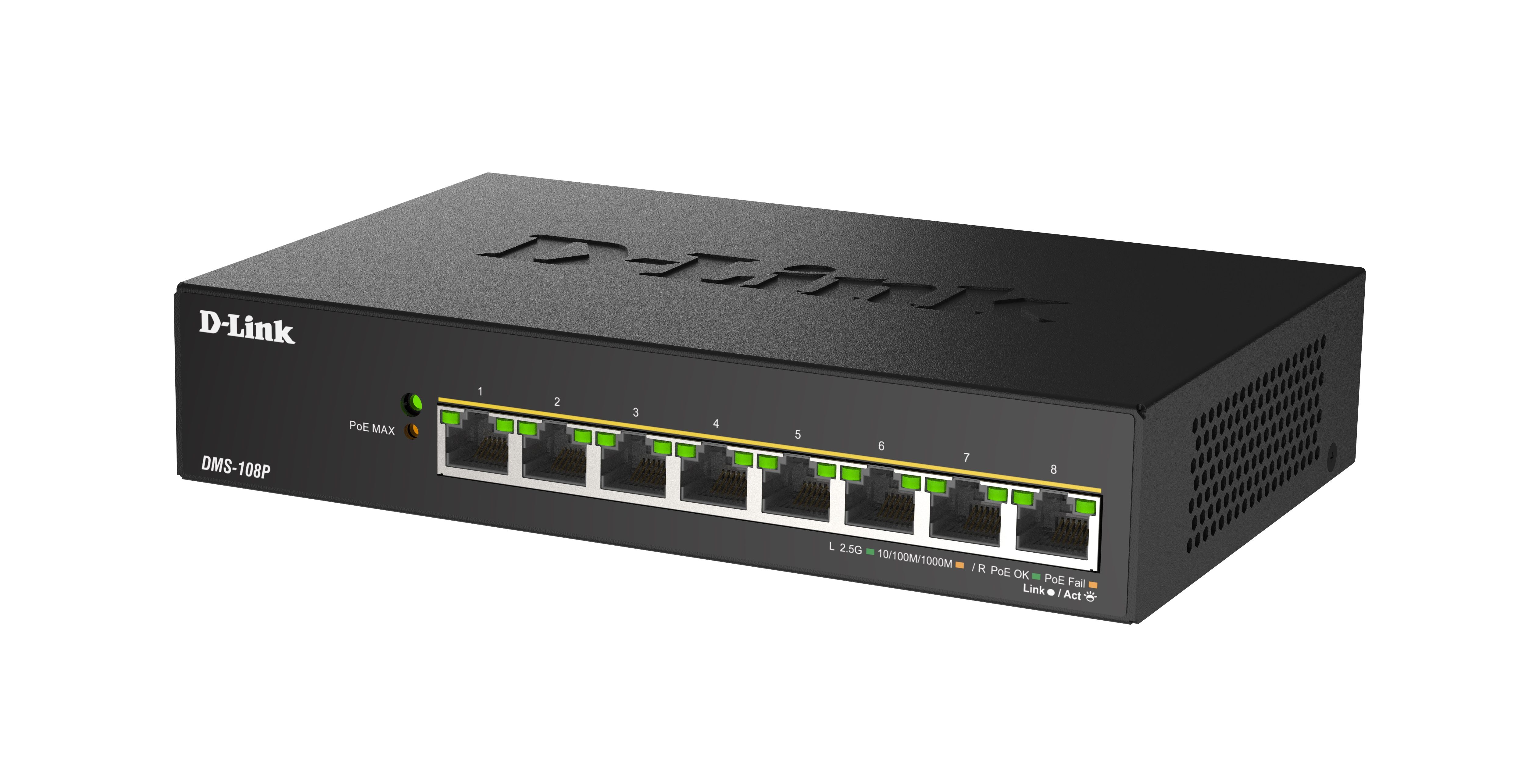 8 портов DMS-108P поддерживают стандарт IEEE 802.3bt PoE. Каждый порт PoE подает питание мощностью до 90 Вт при общем бюджете коммутатора 230 Вт, что позволяет пользователям подключать к DMS-108P устройства, совместимые со стандартами IEEE 802.3af/802.3at/802.3bt. Это позволяет размещать оборудование в труднодоступных местах вне зависимости от расположения электрических розеток и минимизировать прокладку кабеля.