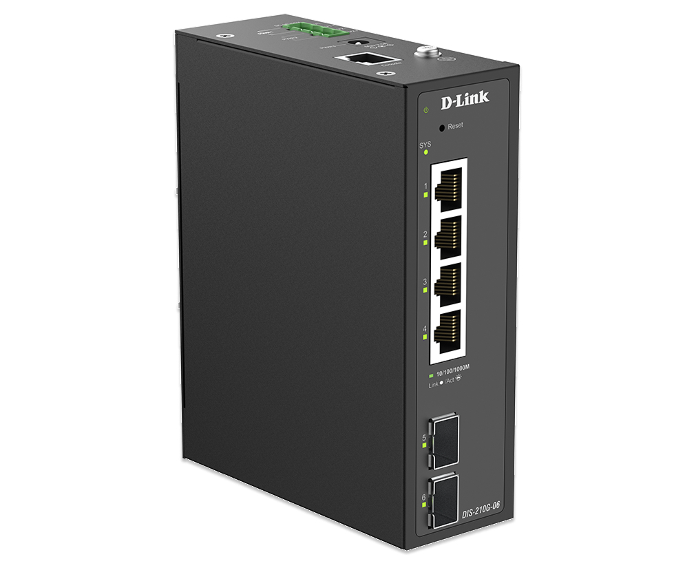 Промышленный управляемый L2 коммутатор DIS-210G-06, оснащенный 4 портами 10/100/1000Base-T, а также 2 портами 1000Base-X SFP, которые используются для организации подключения к высокоскоростной магистрали, предназначен для применения в сетях промышленных предприятий. DIS-210G-06 поддерживает расширенные функции управления и безопасности. Функции управления включают SNMP, управление на основе Web-интерфейса и интерфейс командной строки (CLI).