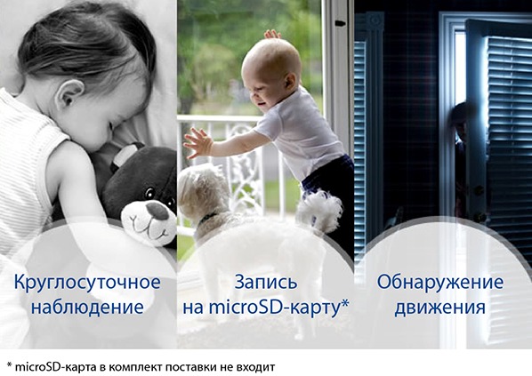 Камера DCS-942L является комплексным решением для видеонаблюдения и может работать самостоятельно без компьютера. Встроенный датчик PIR определяет движение вблизи камеры, позволяя отправлять при этом уведомление со снапшотами и видео на электронную почту. Кроме того, камера может фиксировать различные громкие звуки, например, звон разбитого стекла или плач ребенка, и выполнять запись видео на microSD-карту, установленную в специальный слот камеры. Можно подключить к камере динамик, что обеспечит двустороннюю связь и будет полезным при использовании камеры в детской комнате или на входе в здание/помещение.