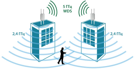 5 ГГц для организации WDS-соединений, 2,4 ГГц для создания локальной беспроводной сети