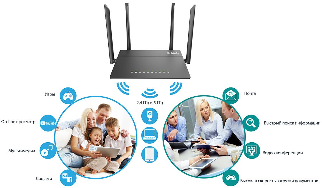 Используя беспроводной маршрутизатор DIR-815, Вы сможете быстро организовать высокоскоростную беспроводную сеть дома и в офисе, предоставив доступ к сети Интернет компьютерам и мобильным устройствам практически в любой точке (в зоне действия беспроводной сети). Одновременная работа в диапазонах 2,4 ГГц и 5 ГГц позволяет использовать беспроводную сеть для широкого круга задач. Маршрутизатор может выполнять функции базовой станции для подключения к беспроводной сети устройств, работающих по стандартам 802.11a, 802.11b, 802.11g, 802.11n и 802.11ac (со скоростью беспроводного соединения до 1167 Мбит/с)3.