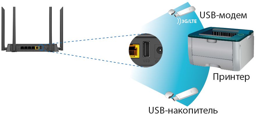 Маршрутизатор оснащен USB-портом для подключения USB-модема, при помощи которого Вы сможете оперативно подключаться к сети Интернет. Кроме того, Вы можете подключить к USB-порту маршрутизатора USB-накопитель, который будет использоваться в качестве сетевого диска, или принтер.