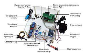 Учебный стенд DTK-1 – это комплект учебного оборудования, предназначенный для проведения лабораторных (практических) работ по основам программирования встраиваемых систем, таких как телекоммуникационное оборудование, устройства интернета вещей, системы умного дома, системы управления, контроля и мониторинга и др. Стенд реализован на базе микрокомпьютера Orange Pi Zero, функционирующего под управлением ОС Linux, и платы расширения – периферийного контроллера на основе микроконтроллера Atmel ATmega328P.