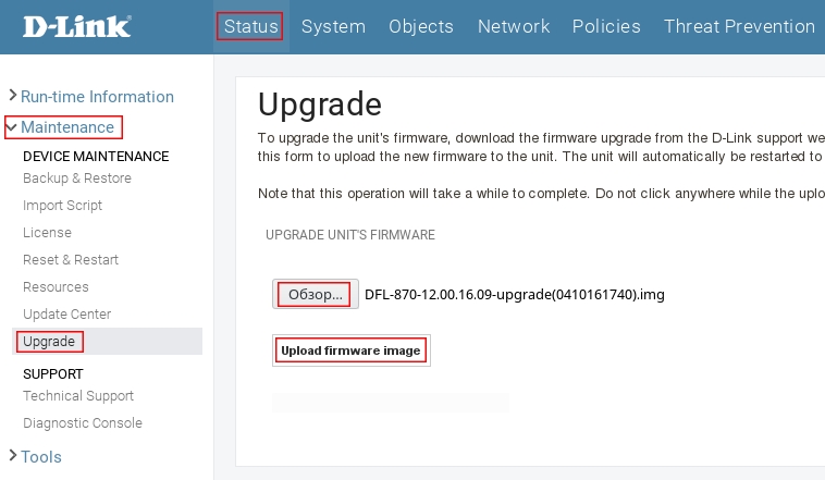 Авторизируйтесь на веб интерфейсе, пройдите Status → Maintenance → Upgrade, нажмите кнопку Обзор (Browse), укажите файл прошивки и нажмите Upload firmware image.