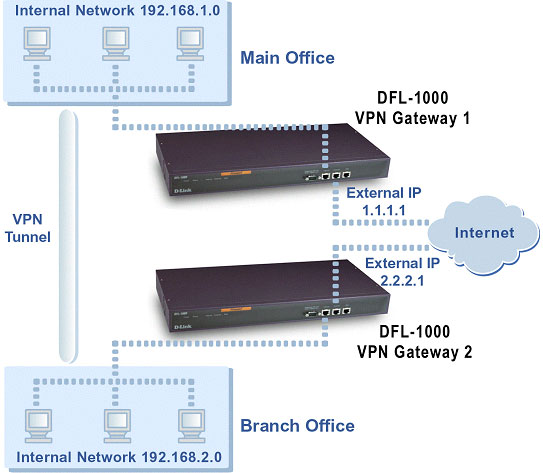 Используя встроенные в DFL-500 и DFL-1000 возможности построения VPN, можно установить безопасные соединения между удаленными офисами или подключить к сети мобильных пользователей, находящихся вне офиса, даже в другой стране. Для такого подключения устройства генерируют зашифрованный трафик и организовывают туннель между сетями, защищенными DFL-1000, DFL-500 или продуктами других производителей, поддерживающих IPSec. Через такой туннель можно работать с сервером или другим компьютером, программное обеспечение которого используюет алгоритмы шифрования DES и 3DES, и протоколы PPTP и L2TP (например с популярными Операционными Системами Windows).