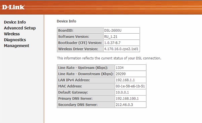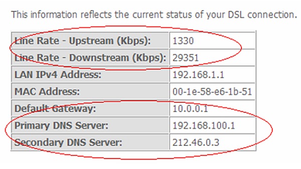 Об успешном подключении будут свидетельствовать следующие параметры: Line Rate Upstream/Downstream (свидетельствует о том, что ADSL подключение установлено), IP адреса шлюза и DNS серверов, полученные в результате PPPoE подключения. На этом настройка устройства закончена.