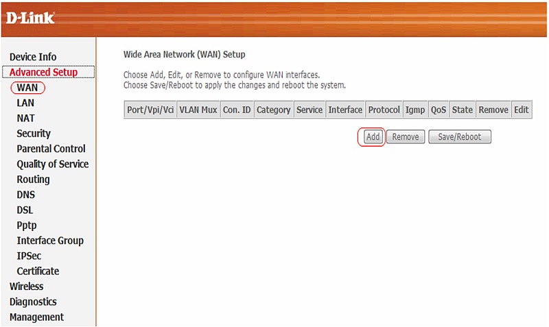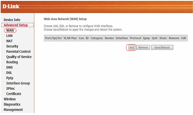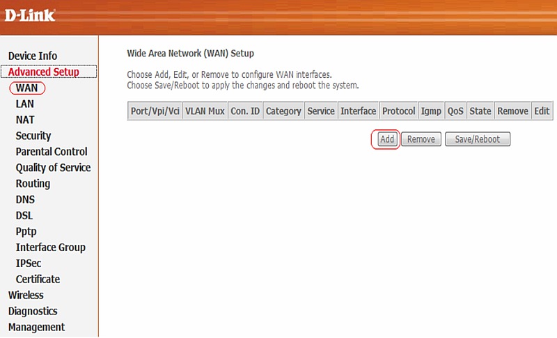 1. В разделе «Advanced Setup» выберите пункт «WAN» и нажмите кнопку «Add» для создания нового соединения.