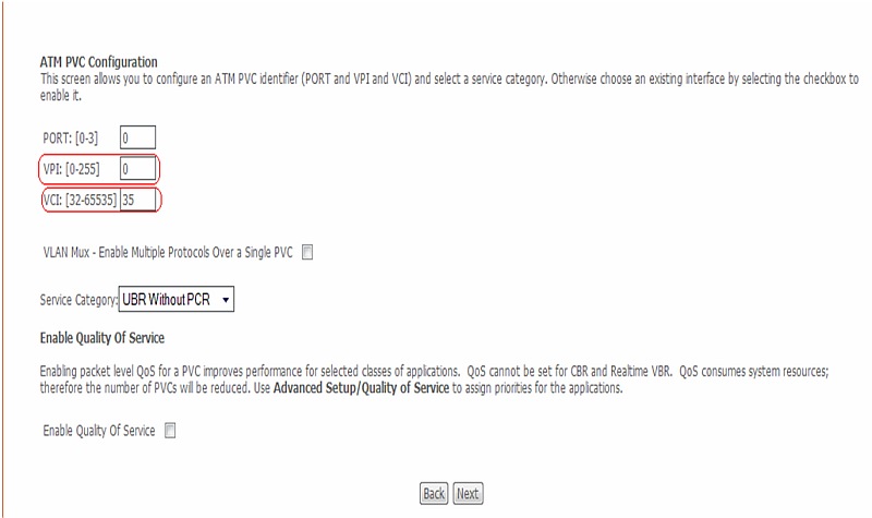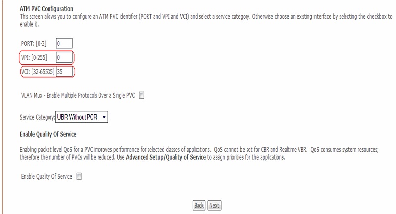 2. На появившейся странице укажите значения параметров VPI и VCI (значения данных параметров предоставляются провайдером) и нажмите кнопку «NEXT».