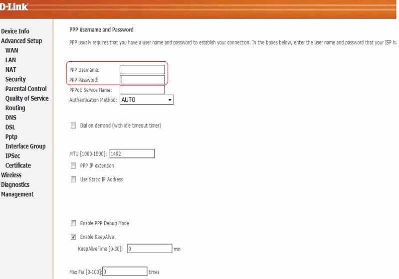 Настройка DSL-2xxxU/BRU/C на работу в режиме маршрутизатора с использованием протокола PPPoE.