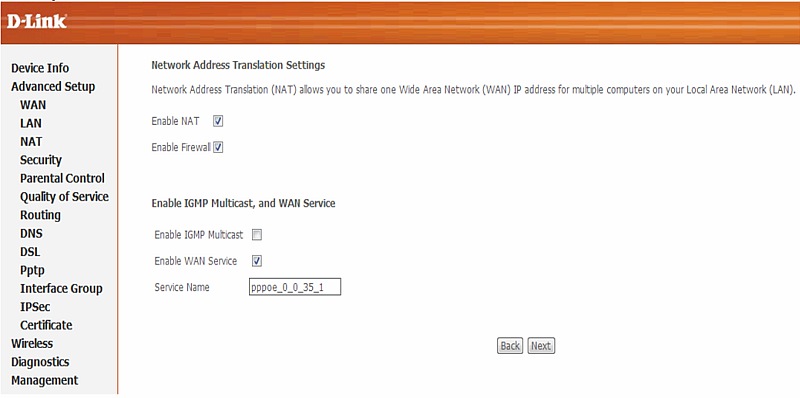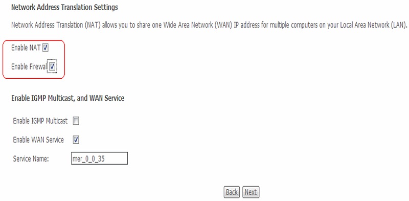 4. На появившейся странице убедитесь, что стоят галочки в пунктах Enable NAT и Enable Firewal. Остальные параметры оставьте по умолчанию и нажмите кнопку «NEXT».
