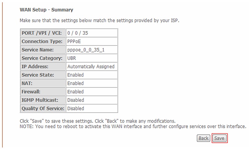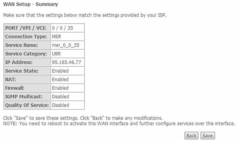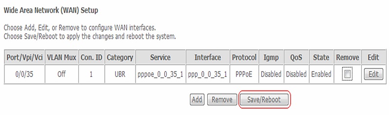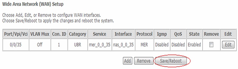 6. После нажатия кнопки «Save» перейдете на страницу «Advanced Setup» > «WAN», на которой увидите созданное подключение. Нажмите кнопку «Save/Reboot» для применения параметров и перезагрузки устройства.