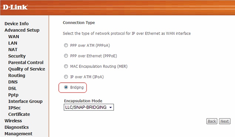 3. На следующей странице в разделе Connection Type установите «Bridging» и нажмите кнопку «NEXT».
