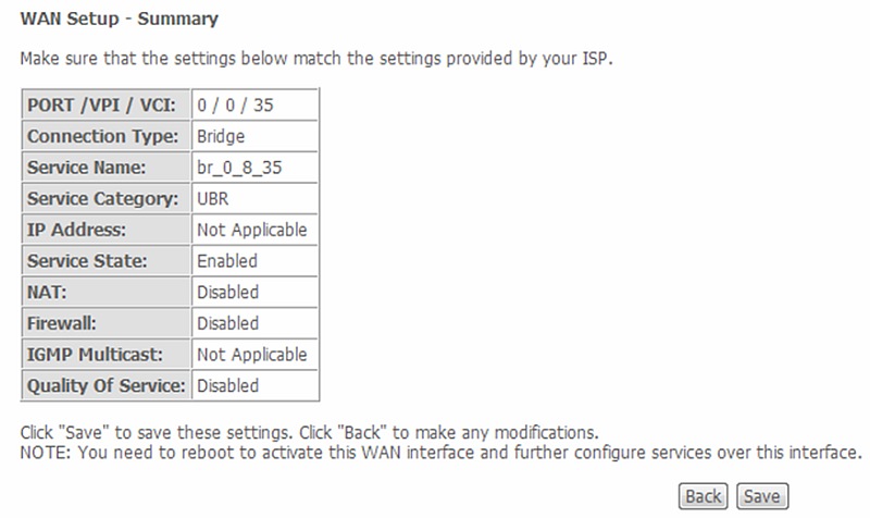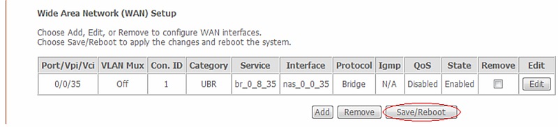 6. После нажатия кнопки «Save» перейдите на страницу «Advanced Setup» > «WAN», где увидите созданное Bridge соединение. Нажмите кнопку «Save/Reboot» для применения параметров и перезагрузки устройства.