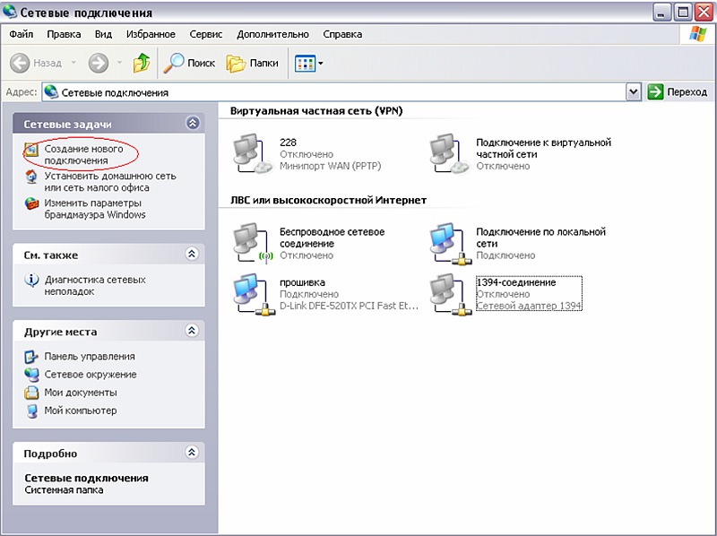 1. Откройте «Панель управления», затем «Сетевые подключения» и выберите пункт «Создание нового подключения»