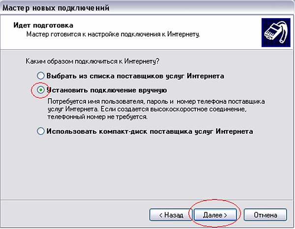 4. Выберите пункт «Установить подключение вручную» и нажмите «Далее»