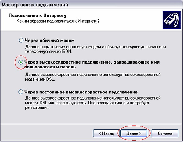 5. Выберите пункт «Через высокоскоростное подключение, запрашивающее имя пользователя и пароль» и нажмите «Далее»