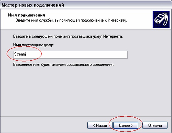 6. В строке «Имя поставщика услуг» наберите ЛЮБОЕ имя (например Stream). Так будет называться созданное подключение. Нажмите «Далее»
