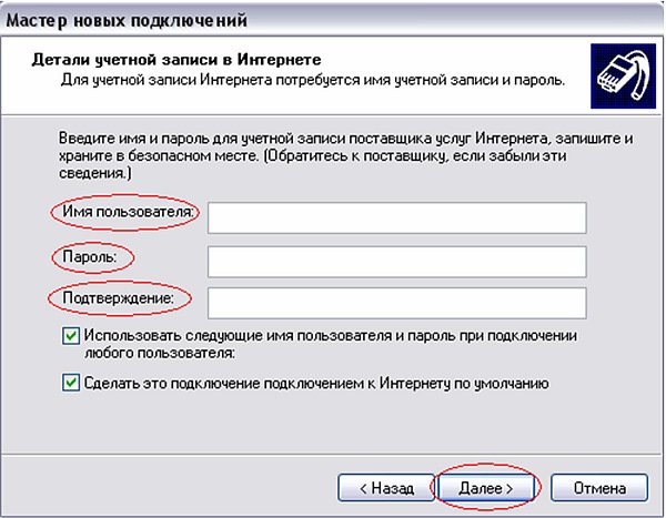 7. В строках «Имя пользователя» и «Пароль» наберите логин и пароль, предоставленные провайдером. В строке «Подтверждение» повторно наберите пароль. Нажмите «Далее».