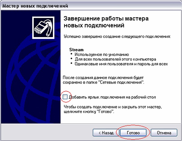 8. По желанию можно добавить ярлык подключения на рабочий стол. Для завершения работы мастера новых подключений нажмите «Готово»