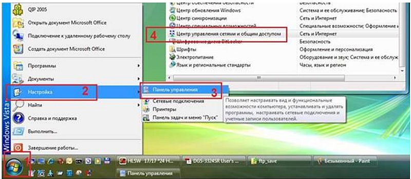 1. Нажмите Пуск [1] -> Настройки [2] -> Панель управления [3] -> Центр управления сетями и общим доступом [4] (Рисунок 1)