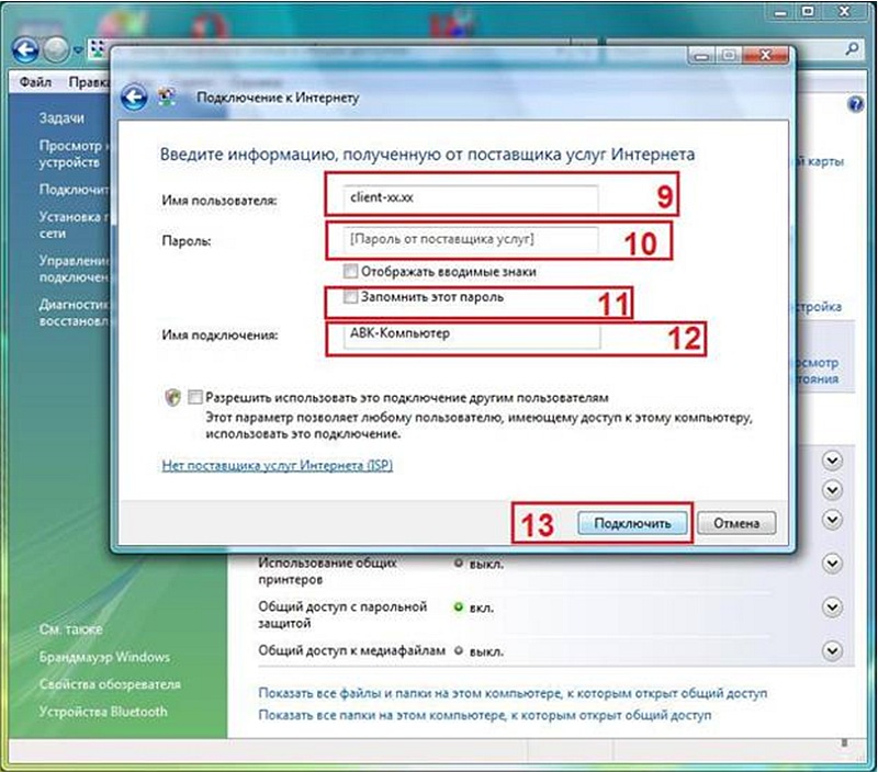5. Введите Имя пользователя [9], Пароль [10] и Имя подключения [12].