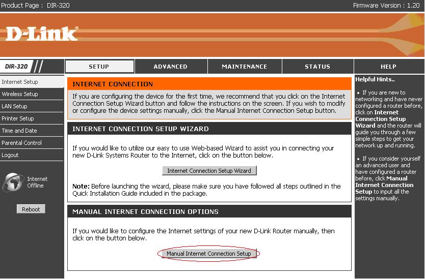 3. Valige Setup - Internet Setup - Manual Internet Connection Setup (Käsitsi Interneti ühendse häälestamine)