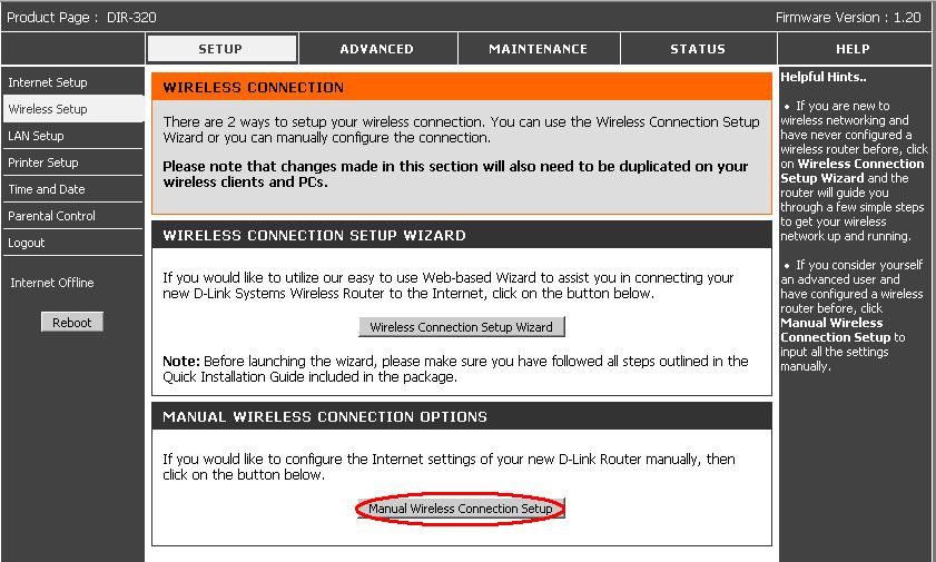 3. Valige Setup - Wireless Setup - Manual Internet Connection Setup