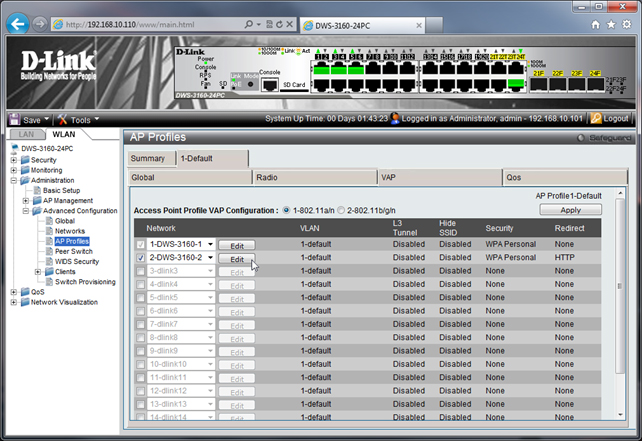 На открывшейся странице в списке имён активных беспроводных сетей (Network) выбираем нужную сеть (в нашем примере – DWS-3160-2) и нажимаем кнопку «Edit».