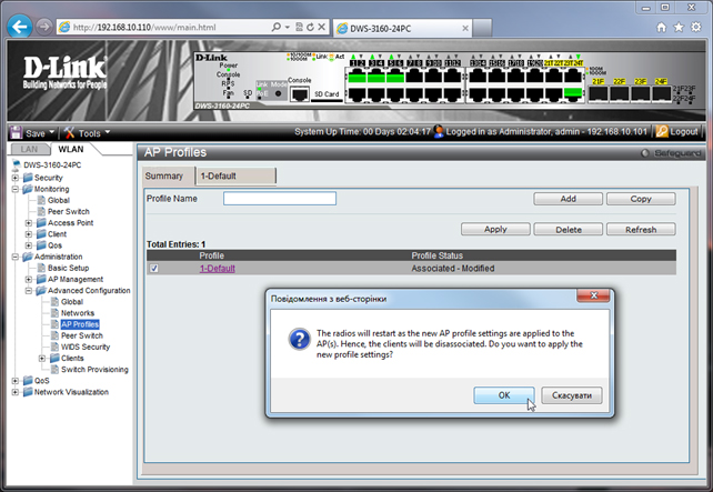 В списке AP Profiles в столбце информации о состоянии изменённого профиля видим его статус «Associated - Modified».