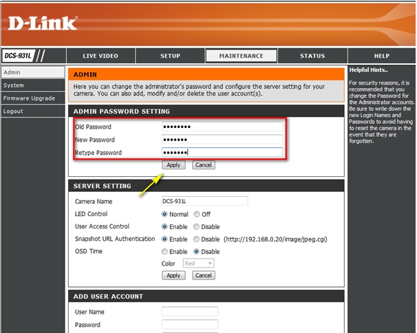 Вопрос: Как задать пароль администратора на камере DCS-9хх?
