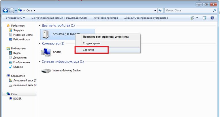 Шаг 3. В разделе Другие устройства найдите DCS-3010 и нажмите правой кнопкой мыши на значок камеры. В открывшемся меню выберите Свойства.
