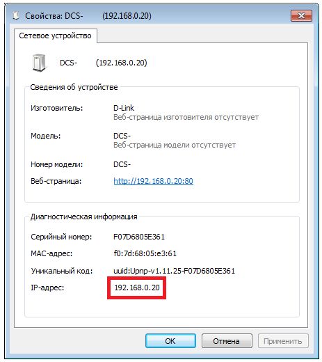 Шаг 4. В нижней части окна Свойства найдите IP-адрес камеры и запишите его.
