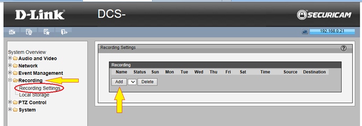 Шаг 6. Сервер добавлен, теперь необходимо включить запись. Для этого в разделе Recording (Запись) перейдите на страницу Recording Settings (Настройки записи) и нажмите кнопку Add (Добавить).
